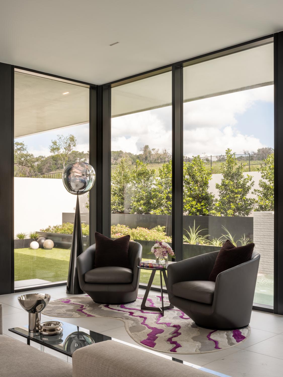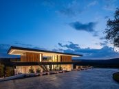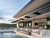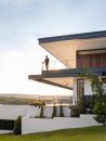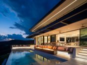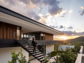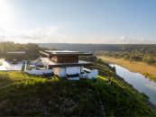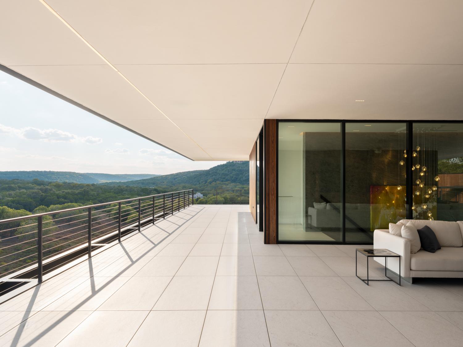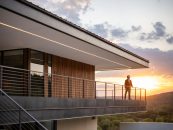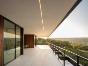 The large glass walls of seamless windows are protected by the cantilevered steel roof, which overhangs the building by 12 feet.