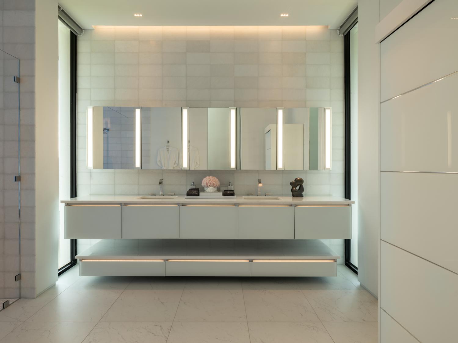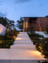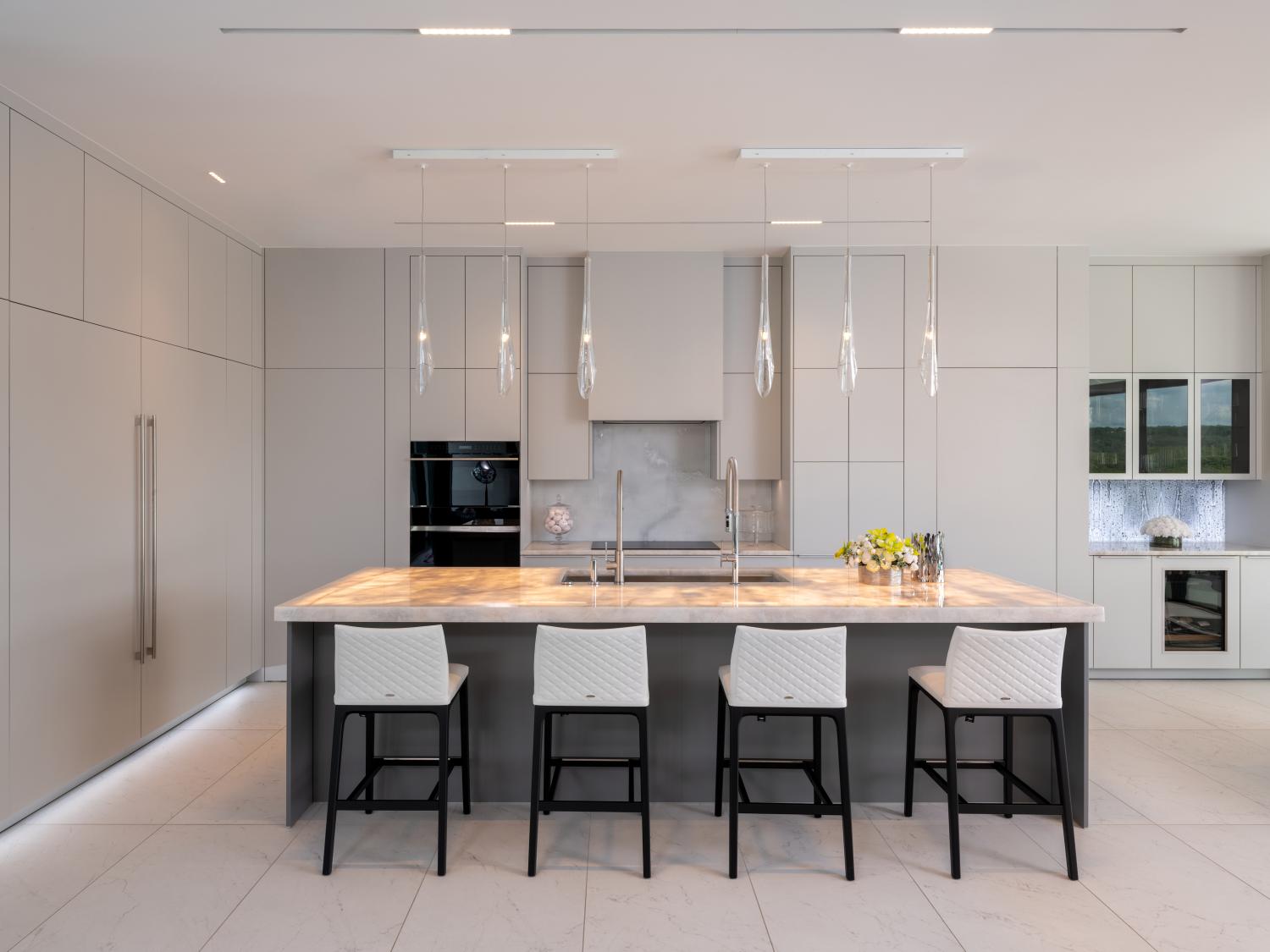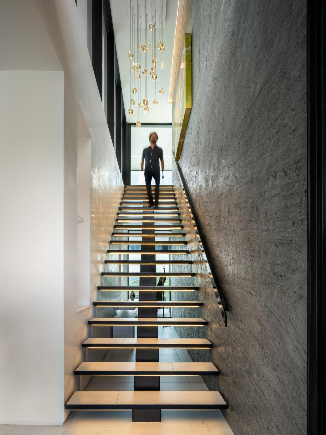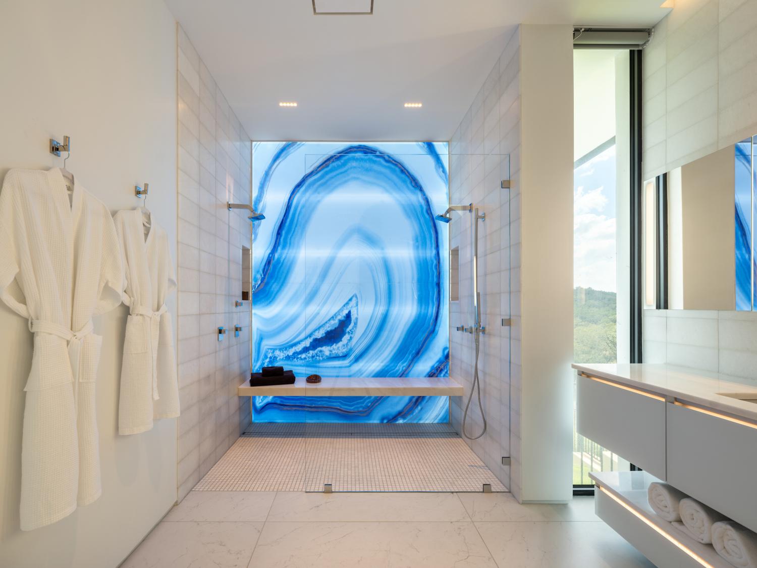 This section of the river takes on a Caribbean blue, which reminds the owners of their sailing trips in the British Virgin Islands.The Florida-based interiors firm of Duce & Co. Created a rich palette of light-colored marbles, plasters and woods to compliment the stone and steel of the exterior. Exterior wood is a pre-weathered thermally-modified Ash.