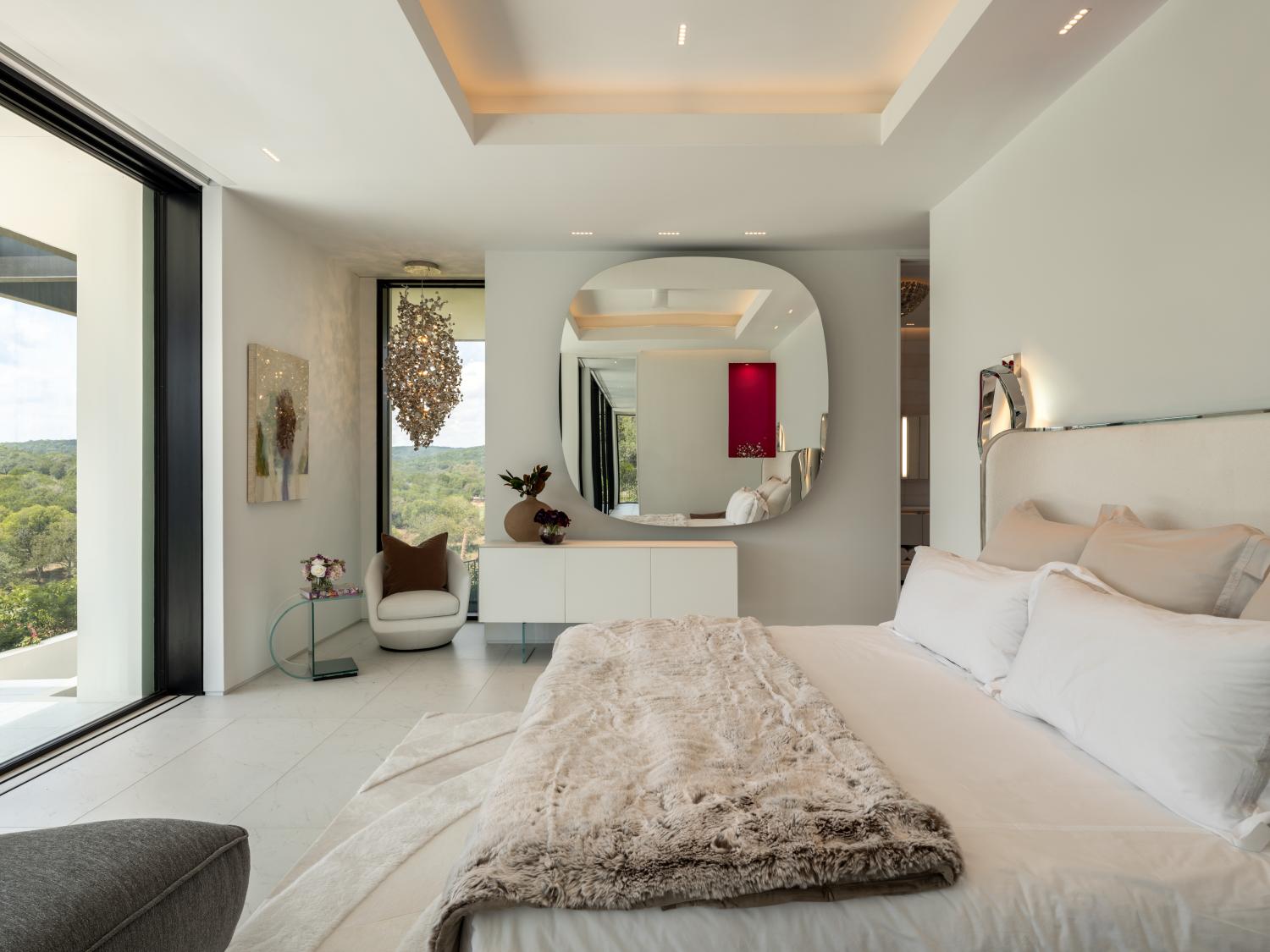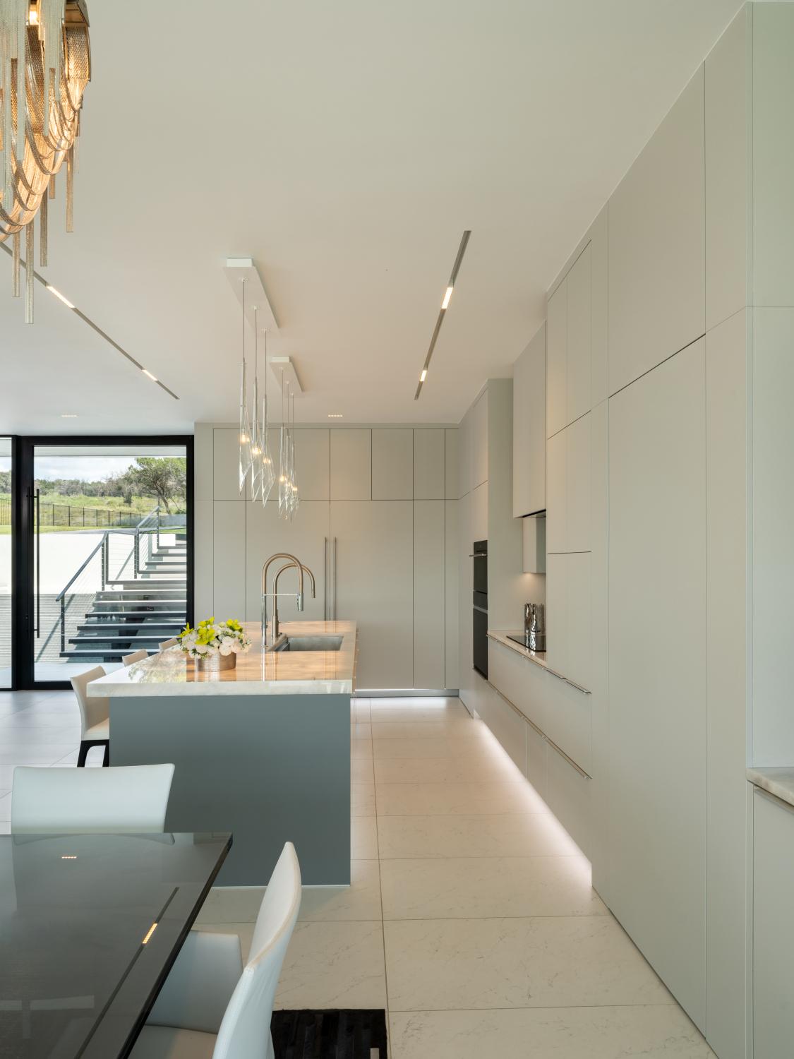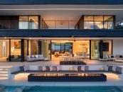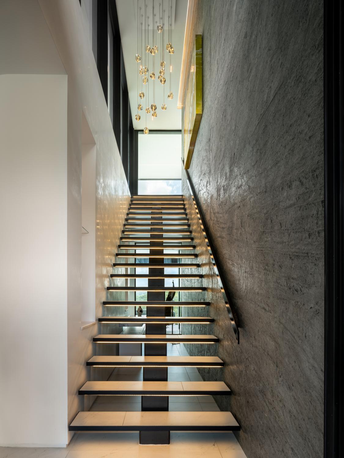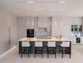 This section of the river takes on a Caribbean blue, which reminds the owners of their sailing trips in the British Virgin Islands.The Florida-based interiors firm of Duce & Co. Created a rich palette of light-colored marbles, plasters and woods to compliment the stone and steel of the exterior. Exterior wood is a pre-weathered thermally-modified Ash.